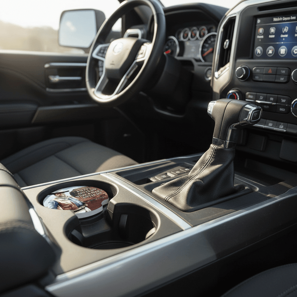 Designed for universal use, these ceramic car coasters for cup holders are 2.5 inches in diameter, fitting most standard car cup holders. Perfect gift for John Wayne fans.