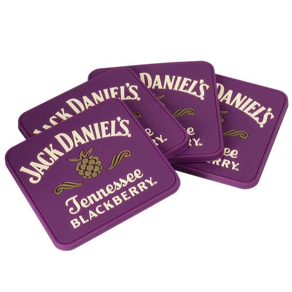 Jack Daniel's Coasters act like mini beverage mats for your glass! No slip, contoured rubber construction protects from drips and spills. Set of four. Dimensions: 3.5"W x 3.5"H