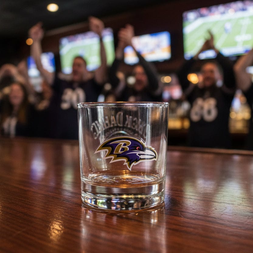 Jack Daniels partnered with various sports teams and created glasses for a black label gift pack. Baltimore Ravens logo on one side and JD on the other.